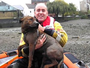His owner was unable to reach him across a particularly deep stretch of mud. The lifeboat crew soon learned that “Junior”, a 7 month old Staffordshire terrier, had impulsively leapt over the river wall and landed unhurt in the thick mud of the foreshore, 15 feet below.
