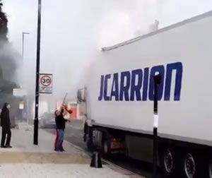 The lorry caught fire after hitting the railway bridge in the middle of the morning. The fire brigade attended but it is believed that prior to their arrival members of the public put out the fire with fire extinguishers and rescued the driver from his cab.